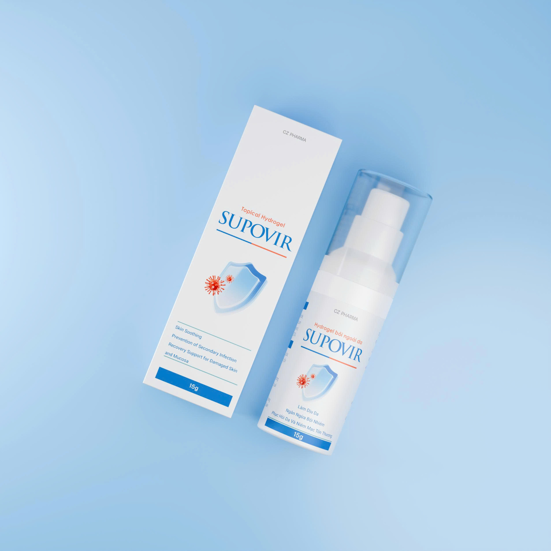 Với dạng bào chế hydrogel (gel thân nước) có khả năng hút và trương nở gấp nhiều lần nên sau khi bôi, SUPOVIR sẽ tạo lớp màng bao phủ, giữ ẩm và nhanh chóng làm dịu mát da, hạn chế cào gãi gây vỡ mụn nước giảm phồng rộp khi bị mụn nhọt, mẩn ngứa, tăng cường khả năng phục hồi.